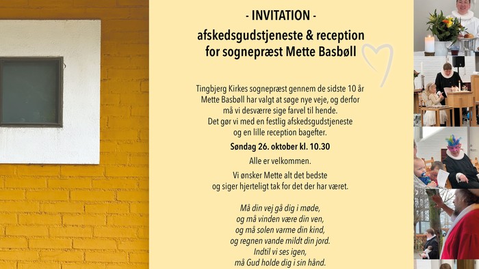 Tingbjerg Kirkes sognepræst gennem de sidste 10 år Mette Basbøll har valgt at søge nye veje, og derfor må vi desværre sige farvel til hende. Det gør vi med en festlig afskedsgudstjeneste og en lille reception bagefter.